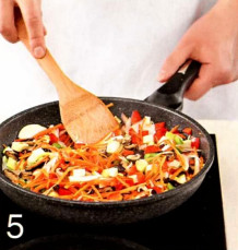 | Время приготовления : : 2 часа 30 минут | | Количество порций : 6 штук | рис с грибами Вам понадобится : 2 стакана длиннозерного риса, 20-30 гр. сухих шиитаке, 2 разноцветных сладких перца, 1 небольшой кабачок, 200 гр. свежего или замороженного зеленого горошка, 1 большая луковица, 1 большая морковка, 4 ст. ложки растительного масла, треть палочки корицы 1 ч. ложку черного перца горошком, 5-6 коробочек кардамона, морская соль, рыбный или соевый соус для подачи  | 1 . Замочите рис в чуть теплой воде на 2 часа. Затем откиньте на сито, установите сито над кастрюлей, наполовину заполненной кипящей водой, и закройте крышкой. Варите на пару до готовности, примерно 25 минут. |  | 2 . Грибы замочите в теплой воде на 30 минут, откиньте на дуршлаг, удалите ножки, шляпки тонко нарежьте. |  | 3 . Лук и морковь очистите и тонко нарежьте. У сладкого перца удалите сердцевину и плодоножки. Кабачок и перец нарежьте небольшими кубиками. |  | 4 . Выньте семена кардамона из коробочек, растолките их в ступке вместе с черным перцем и разломанной на небольшие кусочки корицей. |  | 5 . В сковороде разогрейте масло, обжарьте овощи вместе с грибами на среднем огне, помешивая, до золотистого цвета, 10 минут. |  | 6 . 3а пару минут до готовности всыпьте горошек и растолченные в ступке специи. Смешайте готовый рис с рыбным или соевым соусом, грибами и овощами, подавайте немедленно. | |