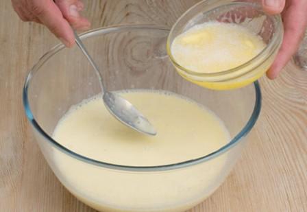 2 . Налите в посуду 1 стакан молока. Вбите 5 яиц. Посолите по вкусу. |