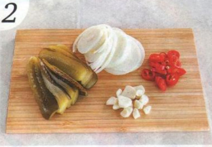 2 . Очистите и тонкими кружочками нарежьте лук и чеснок. Тонко нарежьте вдоль маринованные огурчики. Чили нарежьте колечками слегка наискосок. Семена и перегородки можно удалить, если не хотите, чтобы получилось очень остро.