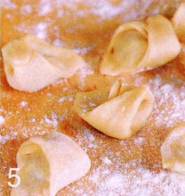 4. Разделим тесто на 3 части. Две накрываем влажным полотенцем, одну раскатать в очень тонкий пласт. Нарезаем его квадратами 4x4 см. положим в центр 1 ч. ложка начинки и сложим тесто по диагонали так, что бы получился трецгольник и хорошо слепите влажными руками края. Поднять центральный уголок, а уголки по краям обернуть вокруг указательного пальца, как показано на фото.