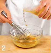 2 . Сначала по каплям, затем тонкой струйкой вливайте, взбивая, растительное масло. Когда смесь начнет загустевать, вливайте масло более широкой струей, не прекращая взбивать.