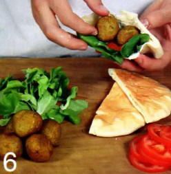 6 . Для подачи прогреть питы, разрежьте пополам, чтобы получились полумесяцы-кармашки. В каждый положите по паре фалафелей, кружок помидора, немного салата приправьте зирой, солью и йогуртом и сразу подавайте.