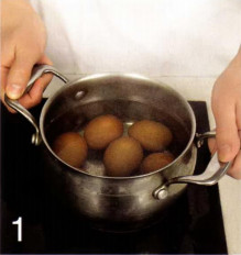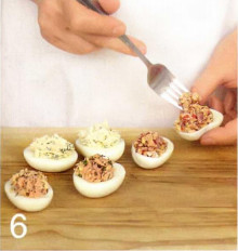 | Время приготовления : 50 минут | | Количество порций : 8 штук | фаршированные яйца с тремя начинками Вам понадобится : 24 крупных яйца, 160 гр. майонеза «Провансаль 67%», соль. Для начинки №1 : 200 гр. филе лосося на коже, 100 гр. икры, 3—4 веточки укропа. Для начинки №2 : 100 гр. сыра эмменталь, 2 ст. ложки сливочного сыра, 4-5 перьев зеленого лука. Для начинки №3 : 150 гр. тамбовского окорока, половина небольшого красного сладкого перца, 1 ст. ложка горчицы с зернышками.  | 1 . В 1 большую кастрюлю уложите яйца в один слой. Залейте холодной водой, всыпьте ложку соли и доведите до кипения и варите 8 минут. |  | 2 . Поставьте кастрюлю под холодную воду на 5 минут. Очистите яйца от скорлупы, разрежьте пополам и выньте желтки в миску. Разомните их с майонезом. Разделите полученю массу на 3 части. |  | 3 . Для начинки №1 влейте в сотейник 2/3 стакана кипящей воды, положите рыбу кожей вниз, закройте крышкой и готовьте 2 минуты. Не открывая, снимите с огня и дайте постоять 10 минут. Затем снимите филе с кожи и разомните вилкой, смешайте с 1/3 желтковой массы, добавив измельченный укроп. |  | 4 . Для начинки №2 натрите сыр на мелкой терке, смешайте со сливочным сыром, измельченным зеленым луком и еще 1/3 желтковой массы. |  | 5 . Для начинки №3 мелко нарежьте ветчину и перец. Смешайте с оставшейся желтковой массой и горчицей. |  | 6 . Разложите начинки по половинкам яиц, горкой. Яйца с рыбой украсьте икрой, остальные - зеленью. | | К сведению : Фаршированные яйца - это очень вкусная и простая в приготовлении закуска, которая прекрасно сочетается практически с любыми начинками. Идеальную пару яйцам может составить майонез «Провансаль 67%». Это соус с плотной текстурой, он не растечется и позволит сохранить идеальную форму блюда. Также он прекрасно дополнит аромат мяса и рыбы. | Предлагаем посмотреть рецепты на пасху: |