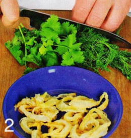 2 . Лук очистим, нарезаем тонкими полукольцами и обжариваем в разогретом масле, 7 минут, дайте остыть. Зелень промойте, чеснок очистим. Зелень и чеснок измельчить, соединить с обжаренным луком, аккуратно перемешаем.