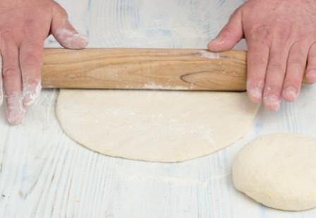6 . Разделите тесто на две части. Рас-катайте тонкие лепешки (круги).