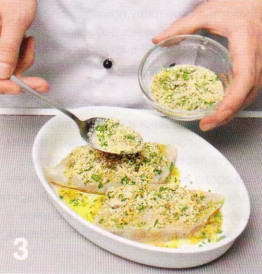 | 3 . Разогрейте духовку до 175 °С. Выложите рыбу в форму для запекания и посыпте сухарной смесью. Сбрызите оливковым маслом и запекайте 12-15 минут до золотистого цвета. |