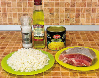300 гр. филе индейки (или куриного филе) 300 гр. отварного риса 200 гр. консервированных ананасов соль по вкусу растительное масло |