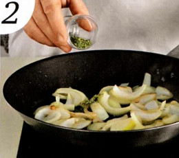 2 . Добавьте смесь сухих трав, обжаривайте 30 секунд. Снимите с огня и немного остудите.