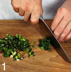 1 . Для закуски с сыром раздавить, очистить и мелко порубить чеснок. Мелко нарежьте зелень.