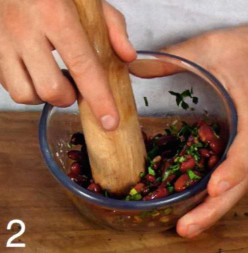 2 . Слегка размять толкушкой фасоль с аджикой, зеленью и чесноком.