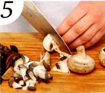 5 . Нарежьте шиитаке, шляпки вешенок и шампиньоны удобными для еды аккуратными кусочками. Процедите грибной бульон, соедините в воке со всеми грибами. Готовьте на сильном огне, помешивая, 2 минуты.