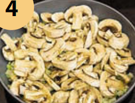 |  | 1 . Лук мелко нарежьте |  | 2 . Грибы нарежьте пластиками. |  | 3 . На растительном масле обжарьте лук. |  | 4 . Добавьте грибы, посолите, поперчите и жарьте 10–15 минут. |  | 5 . Добавьте сметану, тушите 5 минут |