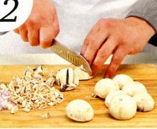 2 . Протрите шампиньоны салфеткой. Выломайте у грибов ножки, удалите самый их низ, нарежьте ножки очень мелко. Шляпки шампиньонов нарежьте пластинками толщиной 5-7 мм.