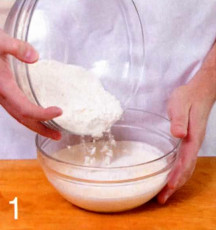 1 . Для опары растворите дрожжи в теплых (38-40 °С) сливках, добавьте сахар, соль и 250 гр. просеянной муки, тщательно перемешайте и оставьте в теплом месте на 40-50 минут. |