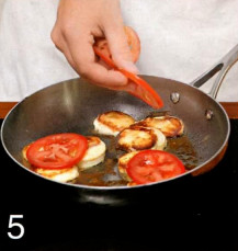 | Время приготовления : 15 минут | | Количество порций : 2 штуки | жареный сулугуни Вам понадобится : 4 куска сулугуни толщиной 1,5-2 см, 1 большой спелый помидор, 2-4 яйца, мука, топленое масло или смесь сливочного с оливковым, несколько веточек зелени (кинза, тархун, рейган), соль и свежемолотый черный перец по вкусу, хлеб для подачи  | 1 . Куски сулугуни должны быть такого размера, чтобы они могли свободно поместиться на вашей большой сковородке с толстым дном. Обсушите сыр бумажными полотенцами и обваляйте в муке, немного втирая ее в поверхность. |  | 2 . Нарежьте помидор тонкими кружками и поперчите. Можно сбрызнуть кружки оливковым или топленым маслом. |  | 3 . Яйца заранее аккуратно разбейте в мисочку. Совсем немного приправьте солью и щедро - перцем. У зелени удалите стебли, листочки порубите или нарвите. |  | 4 . Сильно разогрейте большую сковороду с толстым дном, выложите в нее топленое масло или смесь оливкового со сливочным. Отряхните куски сулугуни от лишней муки и одновременно выложите на раскаленную сковороду. Огонь должен быть максимальным. |  | 5 . Примерно через 1,5-2 минут на сулугуни образуется плотная коричневая корочка, а по бокам сыр будет течь. Переверните сыр широкой лопаткой и сразу же выложите на него помидоры |  | 6 . Примерно через 2 минуты влейте в ско-вороду яйца, через 1 минуту посыпьте яйца зеленью, накройте крышкой и убавьте огонь. Жарьте до желаемой степени готовности яиц. Подавайте немедленно, с мягким хлебом или тостами | |