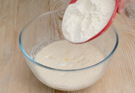 3 . Всыпать муку, размешайте, добавьте сахар. Оставьте в теплом месте для брожения на 30 минут.