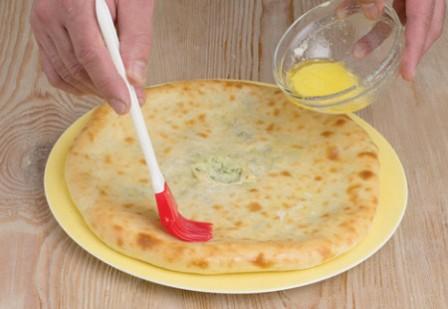 7 . Слегка раскатайте тесто в лепешку. Из начинки сформировать шар и уложите его в центр лепешки. |