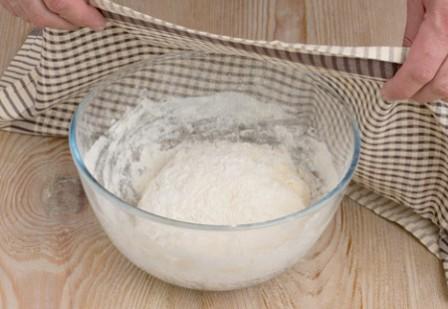 3 . Накройте полотенцем и поставить в теплое место на 35-40 минут. Тесто должно подняться в два раза.