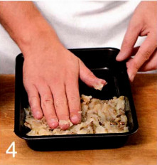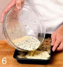 4 . Щедро смажьте маслом глубокую прямоугольную или квадратную форму для выпечки. Смешайте картофель и лук с грибами. Выложите получившуюся массу в форму ровным слоем.