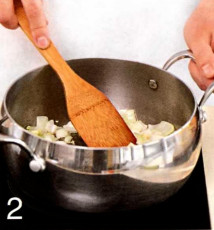 2 . В кастрюле с толстым дном разогрейте масло, положите лук и чеснок, на среднем огне обжарьте до мягкости, 10 минут. Часто помешивайте, чтобы лук не стал коричневым. С