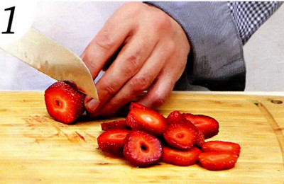 1 . Разогрейте духовку до 180 °С. У клубники удалите плодоножки, нарежьте клубнику толстыми кружками и обжарьте в 50 гр. сливочного масла на сильном огне, 2 минуты. Переложите на тарелку и остудите.