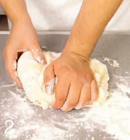 2 . Присыпьте мукой рабочую поверхность, выложите тесто и начинайте вымешивать, подсыпая муку (не больше 1 стакана). Вымешивайте 10 минут. Тесто должно остаться немного липким. Переложите его в чистую большую миску, накройте миску пленкой, поставьте в теплое место подниматься на 50-60 минут.
