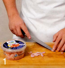 1 . Слейте с креветок масло, немного обсушите их, уложите на доску и разрежьте каждую креветку вдоль пополам.