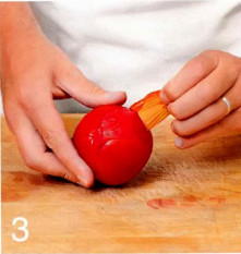 3 . Помидоры обдайте кипятком, затем холодной водой. Удалите кожицу. Порубите помидоры вместе с сердцевиной.