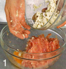 1 . С хлеба срезать корку, мякоть замочить в молоке на 15 минут. Затем хлеб отжать, раскрошить, смешайте с фаршем и желтком. Фарш хорошо отбить, посолить, поперчить и поставьте в холодильник на 30 минут