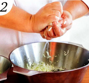 2 . Залейте капусту большим количеством кипящей воды на 5 минут, слейте воду и опять отожмите как можно лучше. Смешайте с манкой, перемешайте руками.