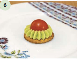 ![]() | 5 . С помощью кулинарного шприца, или ложкой, выложите авокадо на крекер. |