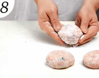 6 . Смачивая руки в горячей воде, берите кусок фарша размером примерно с мяч для большого тенниса и лепите из него гладкий шарик без трещин, с однородной поверхностью.