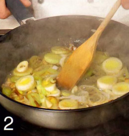 2 . Лук-порей промойте и нарежьте кружками, чеснок измельчите. Положите овощи в ту же сковороду, где готовилась курица, и обжаривайте 4-5 минуты, до мягкости лука. Влейте вино и прогрейте, 1 минуту, затем добавьте бульон, сливки и варите на медленном огне 4-5 минут.