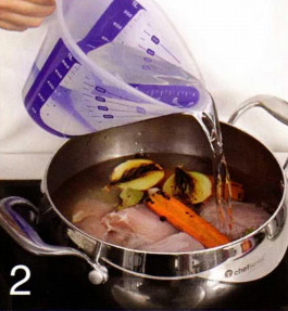 2 . Залейте 2,5 л холодной воды, доведите до кипения, снимите пену с помощью шумовки «Диско» или половника «Диско», добавьте перец горошком и варите 1 ч. Затем курицу выньте, бульон процедите.