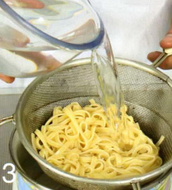 3 . Сварите лапшу до готовности согласно инструкции на упаковке, откиньте на дуршлаг и тщательно промойте холодной водой. Обсушите.