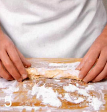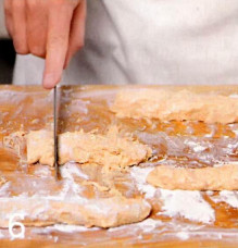 4 . В широкой и глубокой кастрюле вскипятите 3 литра воды. Присыпьте доску мукой. Берите мокрыми руками кусок теста и скатывайте из него на весу колбаску толщиной примерно 2 см.
