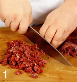 1 . Заранее, за 30 минут, подморозьте мясо и жир, чтобы их было легче резать. Нарежьте мясо очень маленькими кубиками, 4-5 мм. Жир нарежьте кубиками чуть большего размера: 5-6 мм.