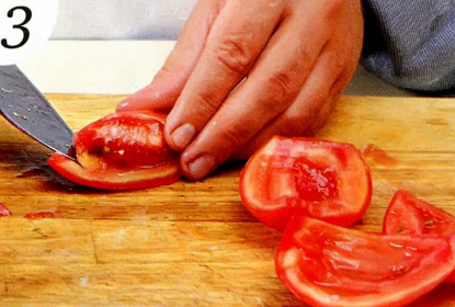 3 . Очистите помидоры от кожицы, удалите сердцевину, мякоть измельчите. Готовьте помидоры с рубленым чесноком и щепоткой соли на слабом огне примерно 20 минут, помешивая.