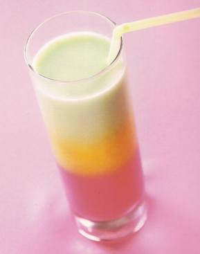 | Коктейль Светофор Вам понадобится : Посуда : Стакан хайбол сироп Гренадин 20 мл сироп банановый 20 мл сироп дынный 20 мл мороженое 150 гр. молоко 150 мл Приготовление :Мороженое с молоком взбить в блендере, разделить на три части. В одну добавить Гренадин, во вторую — банановый сироп и в третью — дынный сироп. Перемешать и перелить в стакан хайбол в указанном порядке.