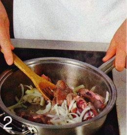 2 . В сотейнике с толстым дном разогреем растительное масло и обжариваем нарезанный полукольцами лук, 6 минут. Добавить мясо и готовить на сильном огне, помешивая, до появления румяной корочки, примерно 15 минут Посолить и поперчить по вкусу.