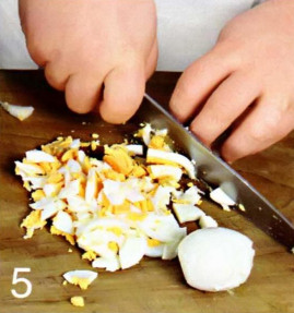 5 . Сварите яйца вкрутую, очистите и порубите не слишком мелко. Смешайте яйца и готовую капусту, посолите.