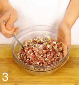 1 . Мякоть свиного окорока нарежьте небольшими кусочками, затем очень мелко порубите тесаком или двумя тяжелыми ножами. Не используйте мясорубку! Как можно более мелкими кубиками нарежьте грудинку.