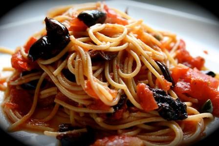| Время приготовления : 40 минут | | Количество орций : 4 - 5 штук | Как приготовить пасту путанеска (северная Италия)Вам понадобится : 500 гр. спагетти Divella, 500 гр. мякоти помидоров Pomito, 1 маленький острыйкрасный перец чили, 200 гр. маслин с косточкамитипа каламата, 1 банка (250 гр. ) тунца в масле,20 гр. анчоусов,3 зубчика чеснока,1 ст. ложки каперсов,2 ст. ложки оливкового масла, соль, черный перец.  | 1 . У перца чили удалите семена и белые перегородки, нарежьте мякоть тонкими полукольцами. |  | 2 . Выложите маслины на доску, и обсушите бумажными полотенцами. Раздавите каждую маслину плоскостью ножа, чтобы через образовавшиеся трещины можно было вынуть косточки. Крупно порубите маслины.. |  | 3 . Измельчите анчоусы. Чеснок раздавите, очистите и мелко порубите. Разогрейте в большой сковороде или сотейнике оливковое масло. Положите чеснок и обжаривайте на минимальном огне 1 минуту. Постоянно помешивайте - чеснок ни в коем случае не должен зажариться.. |  | 4 . Слейте масло с тунца. Добавьте в сковороду чили, каперсы, тунца, измельченные анчоусы и маслины, перемешайте, тушите 2-3 минуты. |  | 5 . Добавьте в сковороду помидоры. Тушите соус на минимальном огне 20 минут без крышки, время от времени помешивая. Жидкость должна выпариться, а соус стать густым. Поперчите соус и посолите, если нужно. |  | 6 . Сварите пасту в подсоленном кипятке согласно инструкции на упаковке, откиньте на дуршлаг, стряхните воду и добавьте пасту в сковороду, тщательно перемешайте. Подавайте немедленно.. | Предлагаем посмотреть рецепты на пасху: |
