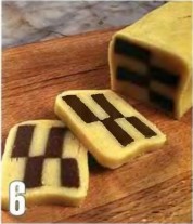 5 . Раскатать неиспользованное песочное тесто до толщины 2 см. обмазать яйцом Шахматный- блок выложить поверх белого теста, со всех сторон завернуть разноцветное тесто в белое. Края белого теста смазать белком и склеить. излишки обрезать. Подготовленный блок положить в морозилку на 30 минут. |  | 6 . Достать блок теста из морозилки.нарезать ломтиками толщиной 5 ммРазложить на противне с антипригарным покрытием. Выпекать в духовке.разогретой до 180° С. 15-20 минут |