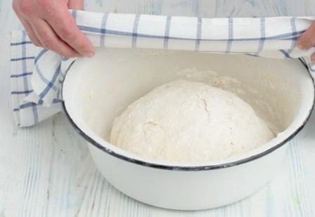 3 . Накройте полотенцем и поставить в теплое место на 35-40 минут. Тесто должно подняться в два раза.