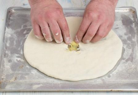 8 . Сформировать из начинки шар и уложите его в центр лепешки. Тесто соберите в кружок и защипнуть края.