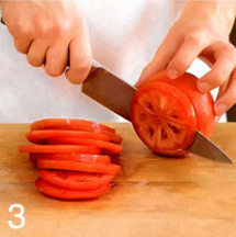 3 . Очистите и тончайшими перьями или полукольцами нарежьте лук. Помидоры нарежьте кружками, разложите на блюде. На помидоры выложите заправку, посыпьте луком, приправьте перцем и подавайте.