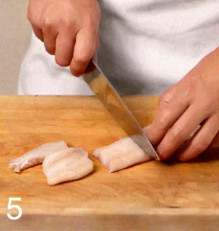 5 . Влейте в сковороду с луком и паприкой бульон и вино. Закройте крышкой и поставьте на минимальный огонь. Тем временем нарежьте рыбу средними кусками. Сильно разогрейте сковородку, где жарились чеснок и хлеб, быстро обжарьте рыбу на сильном огне порциями.