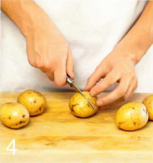 4 . Вымойте картофель щеткой Надрежьте каждую картофелину крест-накрест, не разрезая до конца примерно на треть. Посолите, полейте оливковым маслом..