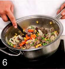 6 . Добавьте язык и вино или воду, готовьте 10 минут после чего всыпьте горошек и кукурузу, приправьте солью, перцем и сладкой паприкой. Готовьте под крышкой 5-8 минут. Подавайте горячим.